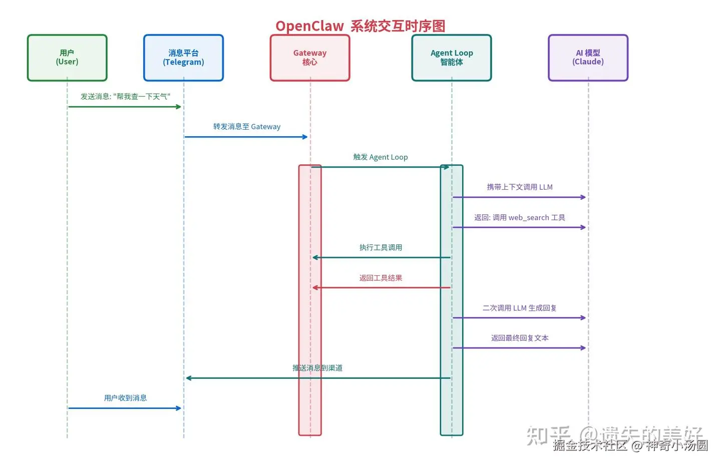 以用户在 Telegram 发送"帮我查一下今天的天气"为例,完整链路如下: