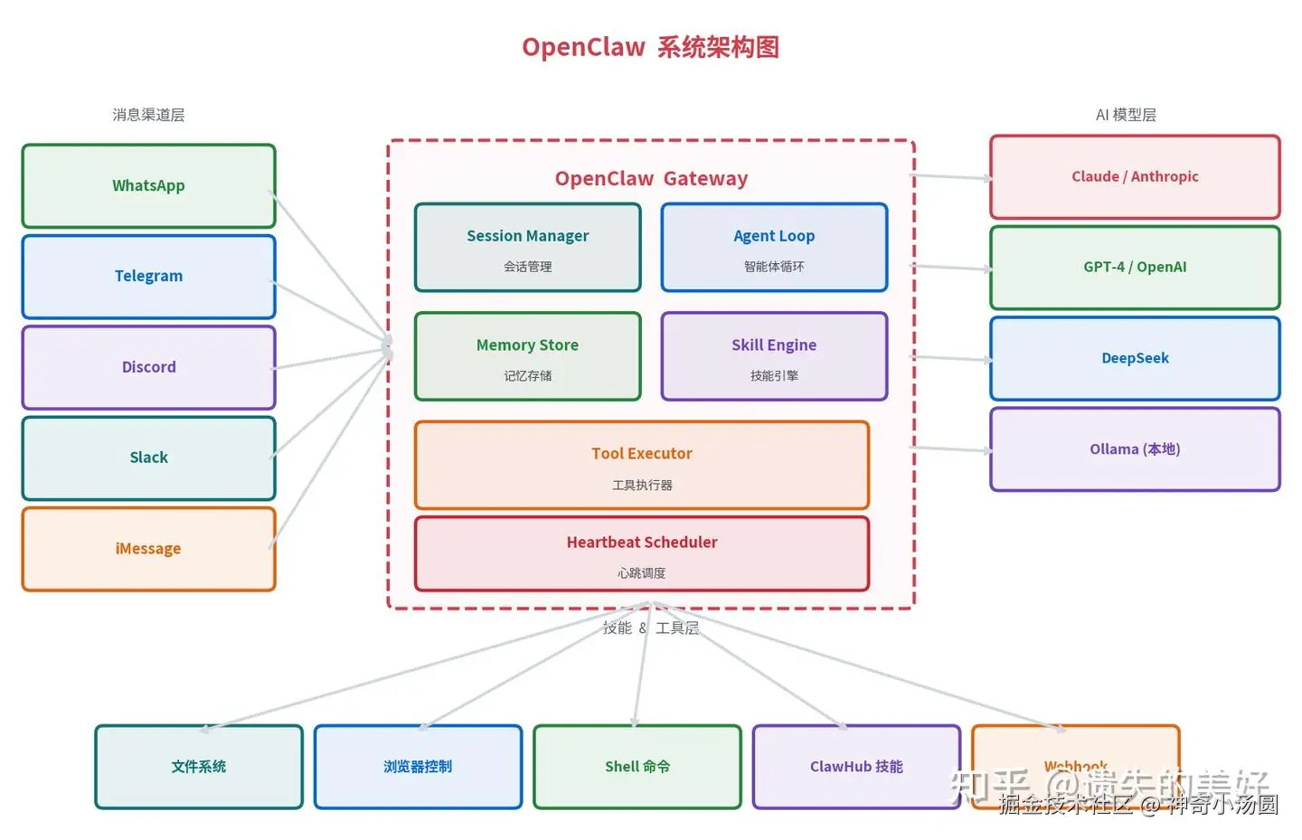 OpenClaw 采用清晰的三层架构设计: