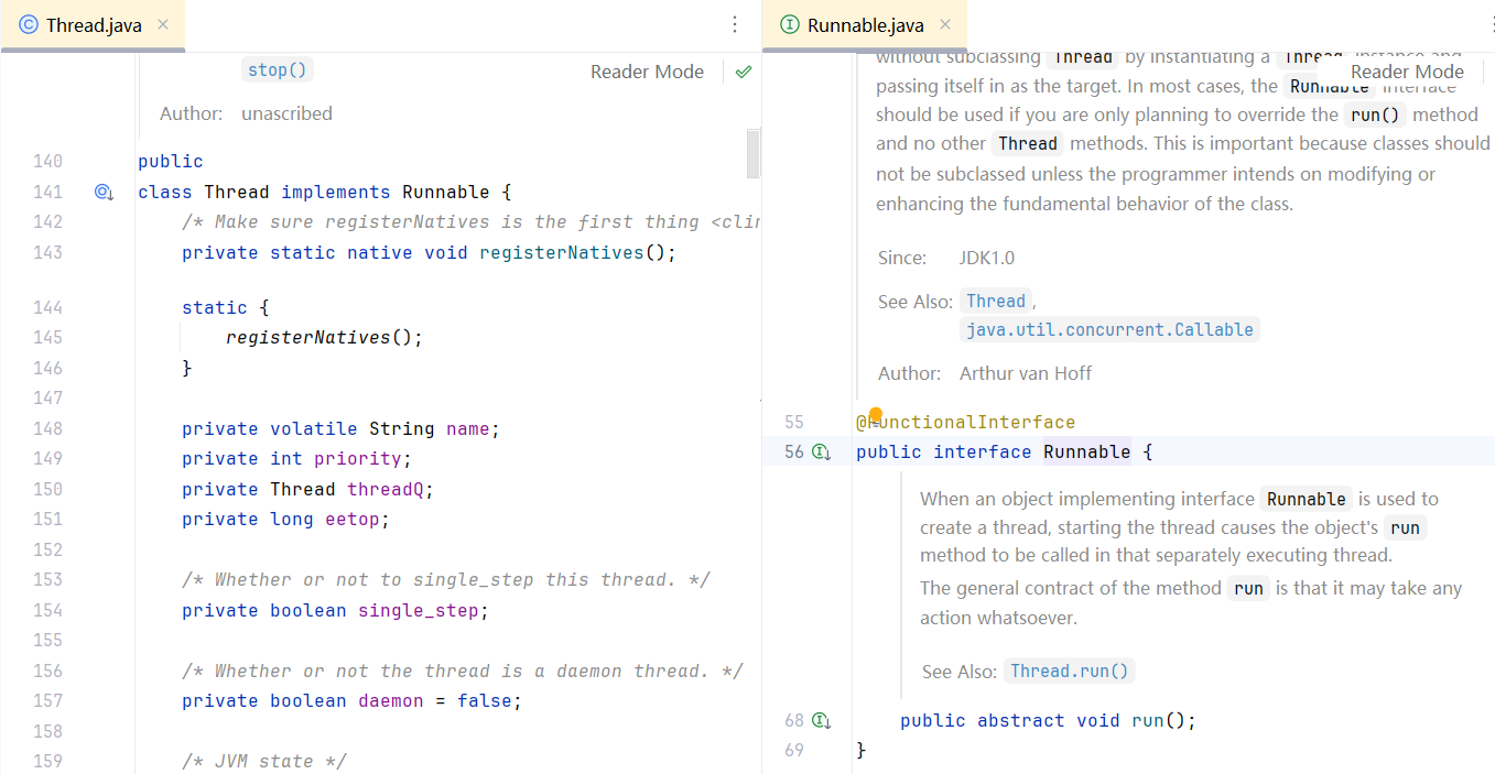 PS:当我们点进 Thread 原代码时,发现 Thread 实现了 Runnable 接口,而 Runnable 接口中只有一个 run 方法: