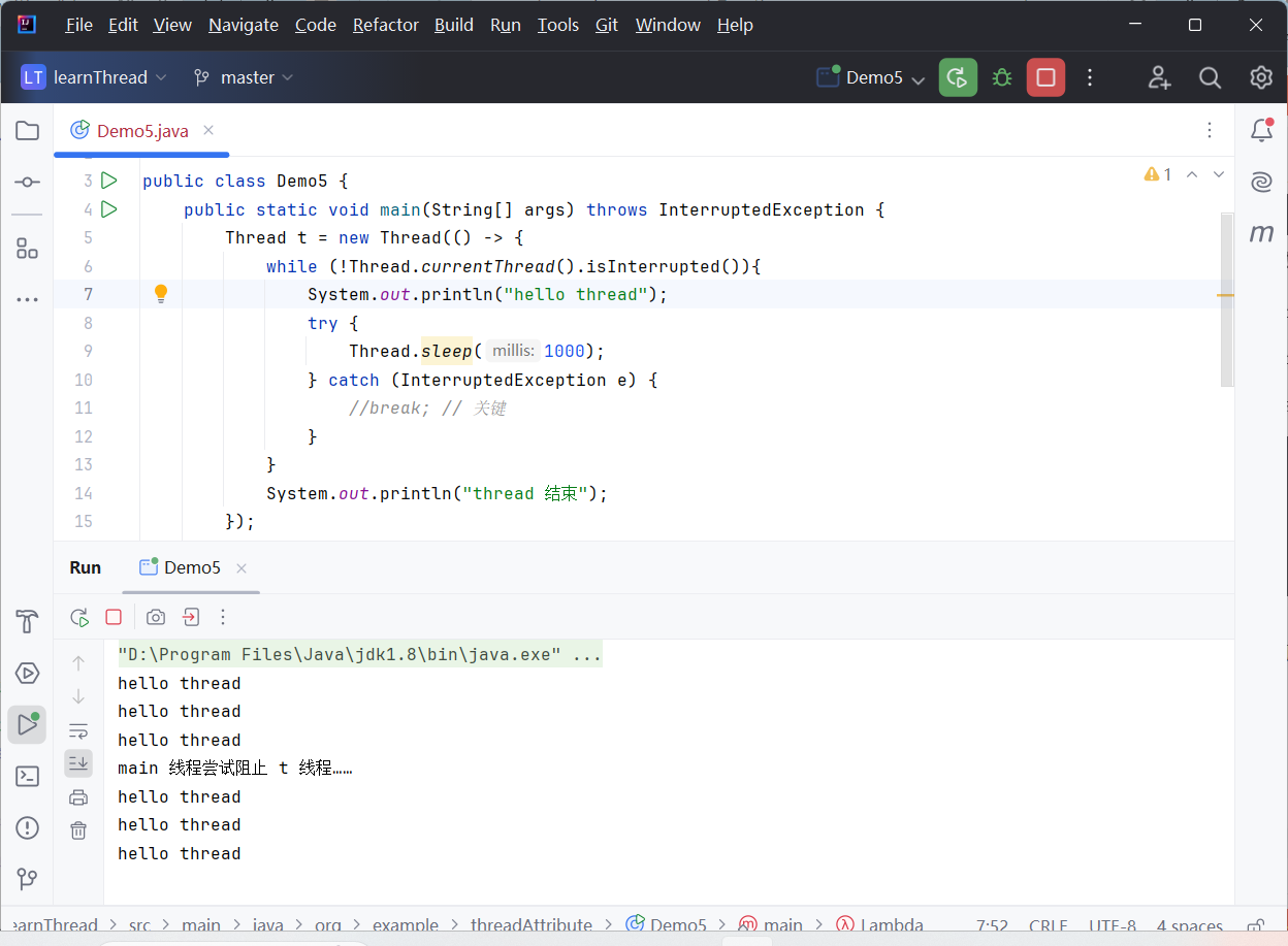 正常情况下,调用 interrupt 方法就会修改 isInterrupted 方法内部的标志位,将其设置为 true;但是上述代码中的interrupt 将 sleep 唤醒了。这种被提前唤醒的情况下,sleep 就会在唤醒之后,将 isInterrupted 的标志位设置回 false。因此线程如果继续执行循环的条件判定,就会发现能够继续执行。