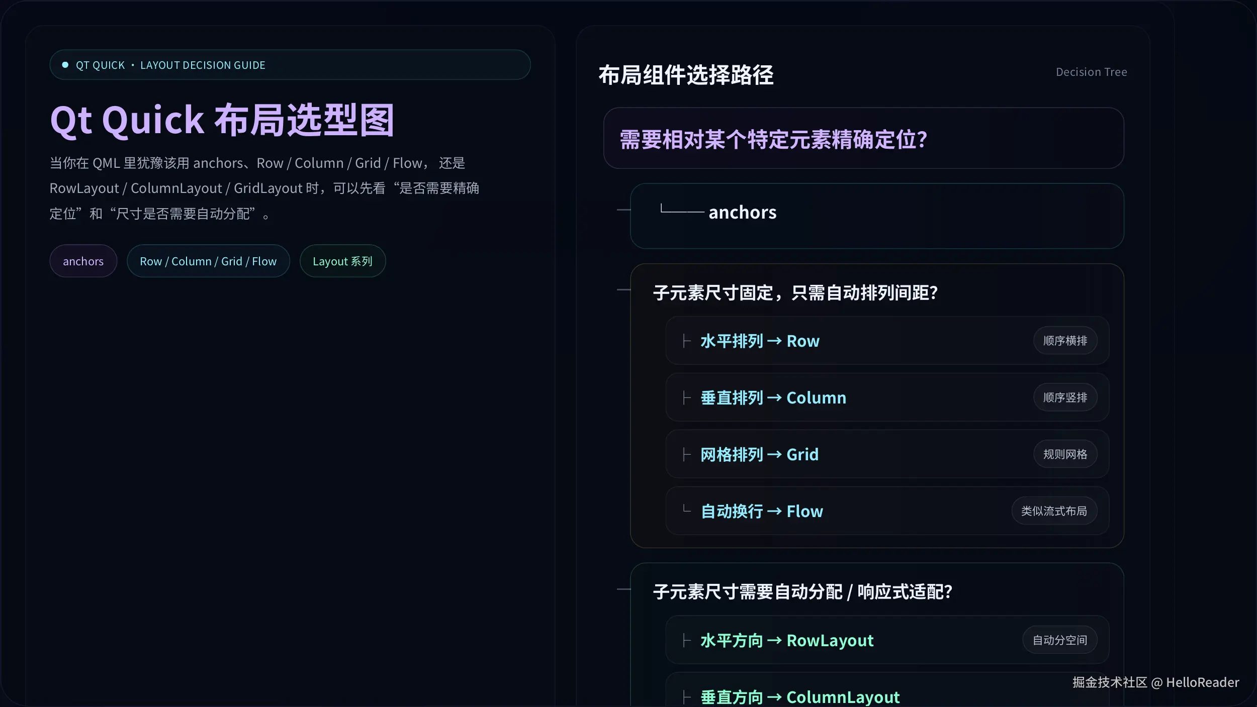Qt Quick 提供了三套定位与布局机制,各有适用场景: