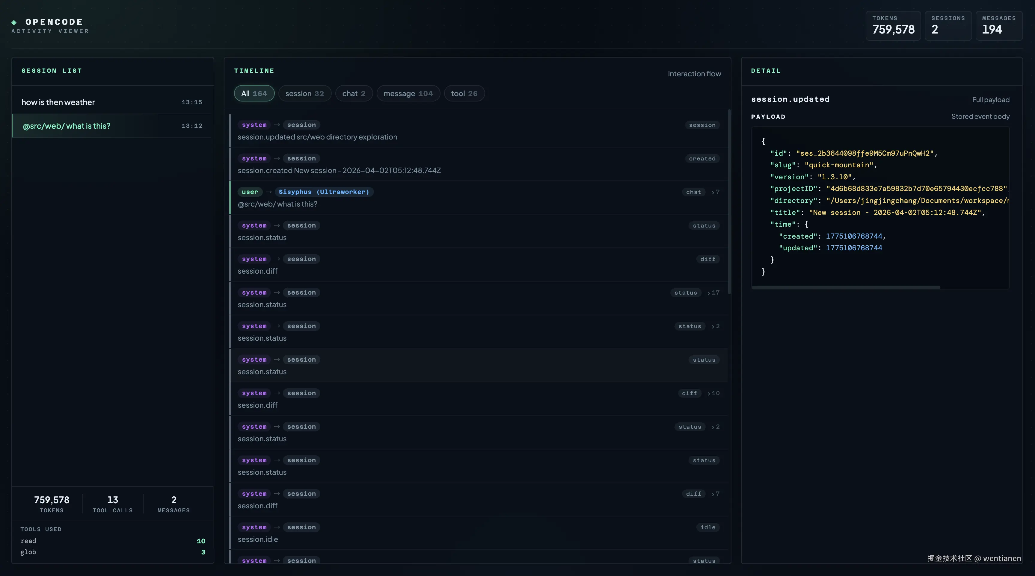 它不是要替代 OpenCode,也不是想把终端再包一层更花的 UI。它更像是给 OpenCode 加了一个"活动观察层":把本地运行过程中产生的 session、message、tool、chat 这些事件记录下来,然后在浏览器里用一个 Viewer 把它们组织起来。