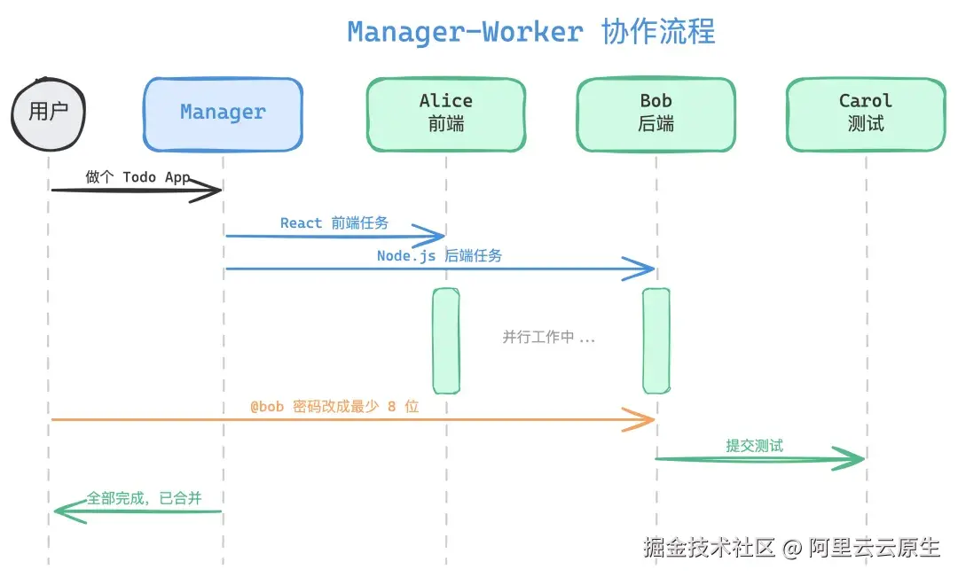 多 Agent 的思路很直接:一个 Manager 负责管理,下面多个 Worker 各司其职。Alice 做前端,Bob 做后端,Carol 做测试,同时开工,互不干扰。每个 Worker 有独立上下文,不会互相污染,而且可以用不同的模型,写代码的用 Opus,查资料的用 Haiku,成本能省 60% 到 80%。