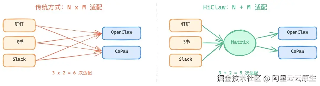 HiClaw 在中间加了一层 Matrix 协议,所有渠道桥接到 Matrix,所有运行时只需实现 Matrix 接口。3 个渠道 + 2 个运行时,从 6 次适配降到 5 次,规模越大优势越明显。CoPaw 接入 Matrix 只写了大约 680 行代码,就自动打通了所有消息渠道。