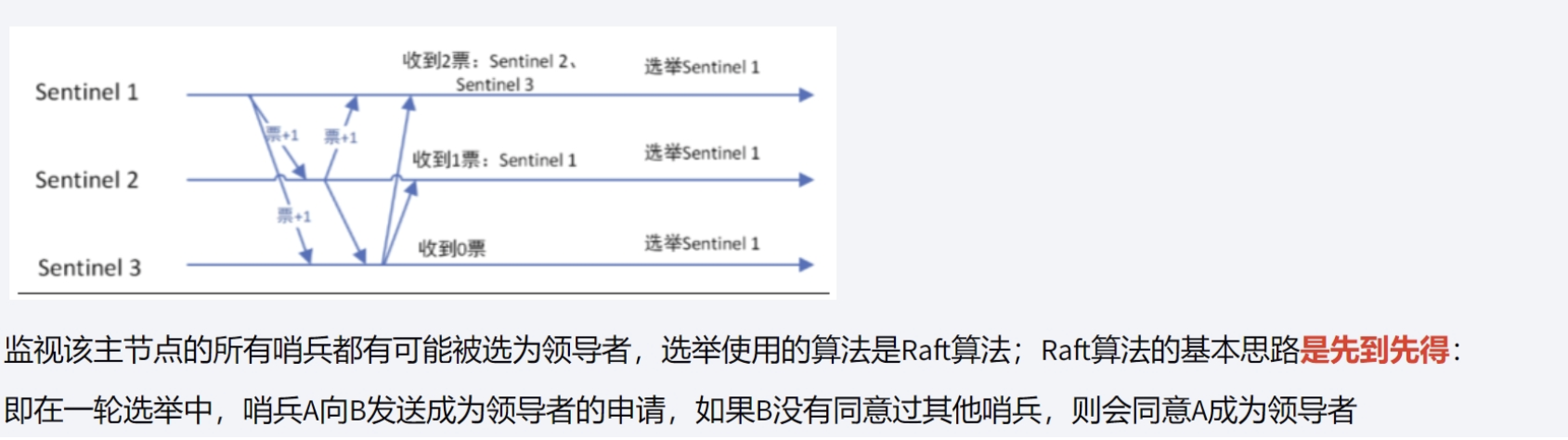 - 目标sentinel回复是否同意master下线并选举领头sentinel,选择领头sentinel的过程符合先到先得的原则。举例:sentinel1判断了 客观下线,向sentinel2发送了第一步中的命令,sentinel2回复了sentinel1,说选你为领头,这时候sentinel3也向sentinel2发送第一步的命令,sentinel2会直接拒绝回复