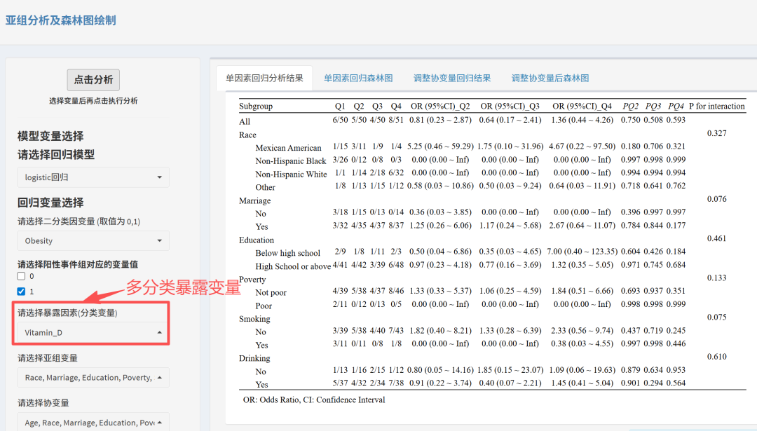 接着,依次选择我们的多分类暴露变量,亚组变量及需要调整的协变量。再【点击分析】,右侧直接展示分析结果。