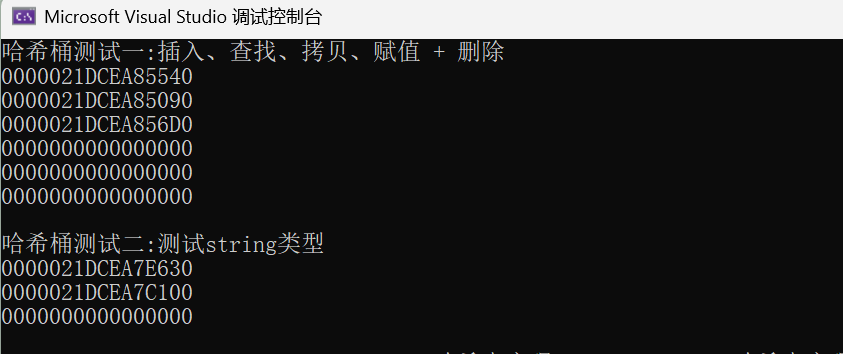 cout << "哈希桶测试一:插入、查找、拷贝、赋值 + 删除" << endl;
