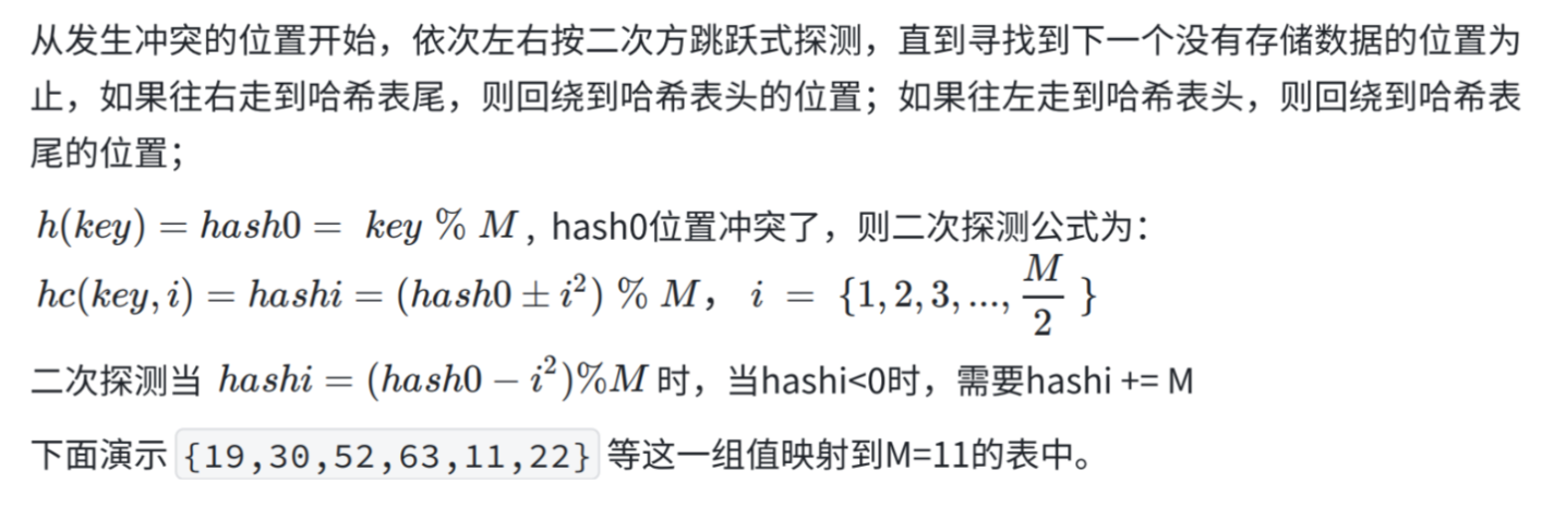 在开放定址法中所有的元素都放到哈希表里,当一个关键字key用哈希函数计算出的位置冲突了,则按照某种规则 找到一个没有存储数据的位置进行存储 ,开放定址法中负载因子一定是小于1的 。这里的规则有三种:线性探测、二次探测、双重探测。