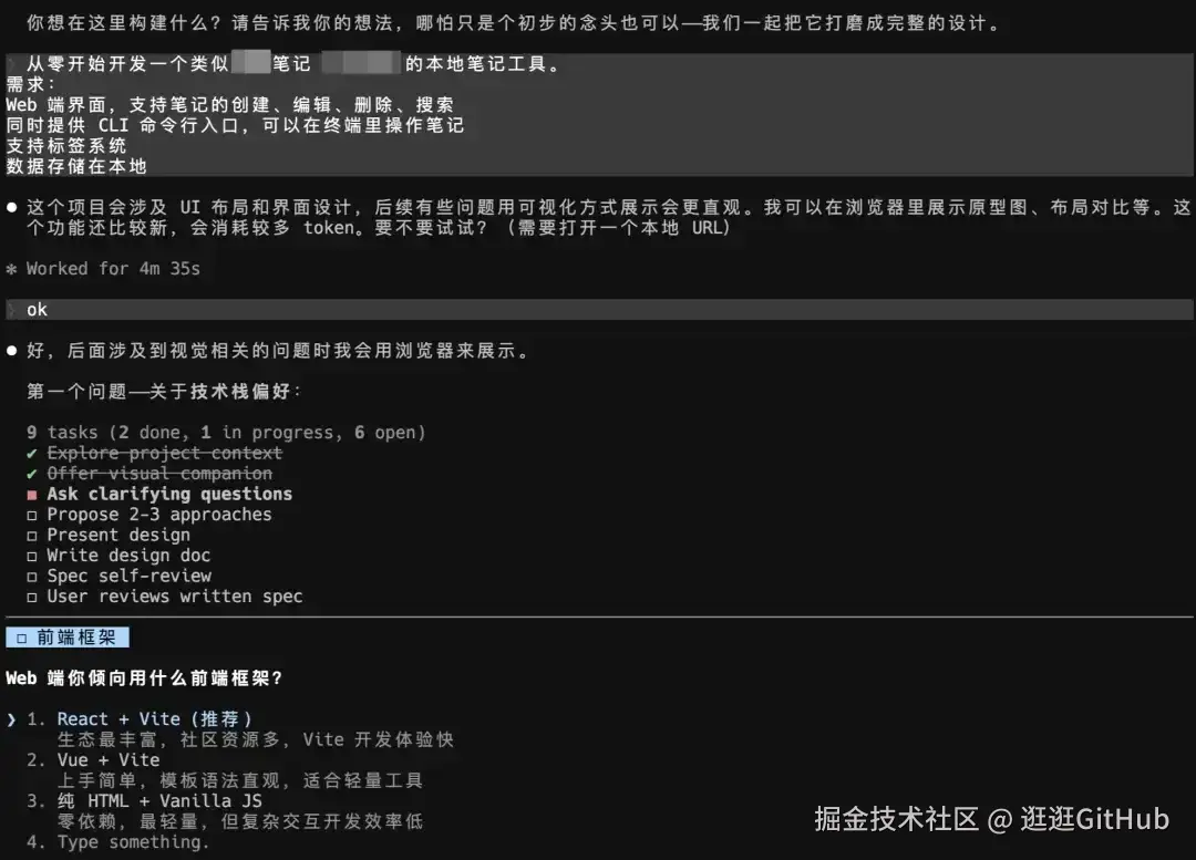 而是先和你对话,确认需求范围、确认技术选型和前端框架。