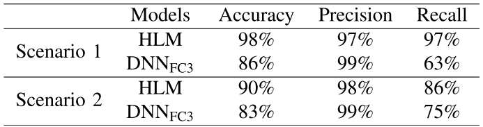 - Scenario 1中,HLM召回率(97%)比DNNFC3(63%)高出34个百分点;