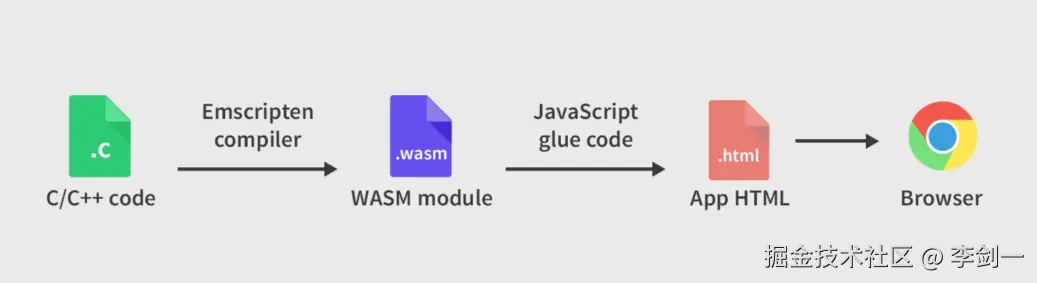 Wasm 是开发者用 C/C++、Rust、Go 等语言编写高性能代码,再通过编译工具将其编译成 .wasm 二进制文件。