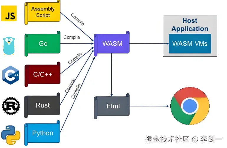 Wasm 的运行是不依赖具体的浏览器环境,只要有对应的运行时(如 V8 引擎、Wasm3 引擎),就能在任何平台运行。