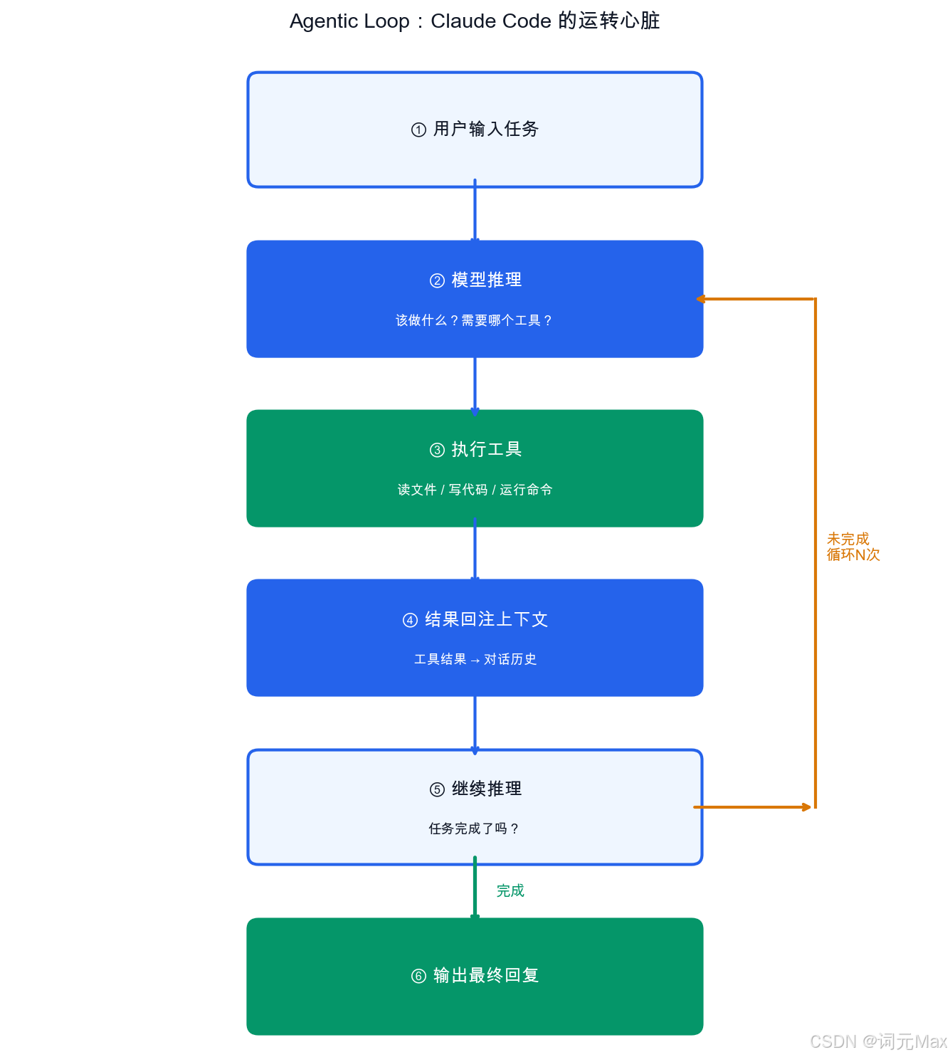如果 Harness 是一台机器,Agentic Loop 就是它的发动机。整个 Claude Code 的运转,归根到底就是一个循环: