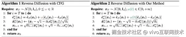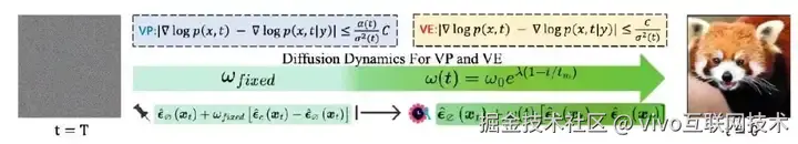 标准 CFG: <math xmlns="http://www.w3.org/1998/Math/MathML"> ϵ ^ ω ( x t , t , y ) = ϵ ^ ∅ ( x t , t ) + ω ( ϵ ^ c ( x t , t , y ) − ϵ ^ ∅ ( x t , t ) ) . \hat\epsilon_\omega(x_t,t,y)=\hat\epsilon_{\emptyset}(x_t,t)+\omega\big(\hat\epsilon_{c}(x_t,t,y)-\hat\epsilon_{\emptyset}(x_t,t)\big). </math>ϵ^ω(xt,t,y)=ϵ^∅(xt,t)+ω(ϵ^c(xt,t,y)−ϵ^∅(xt,t)). 常见做法使用固定 <math xmlns="http://www.w3.org/1998/Math/MathML"> ω \omega </math>ω,但它默认"条件/无条件差异在所有时间步同等重要"。我们的理论与实证显示:这种差异在扩散时间上是动态变化的 ,因此固定 <math xmlns="http://www.w3.org/1998/Math/MathML"> ω \omega </math>ω 难以同时兼顾早期结构形成与后期精确对齐。