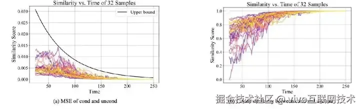 - (a) 条件与无条件 score 的 MSE 随时间变化,并被一个随 <math xmlns="http://www.w3.org/1998/Math/MathML"> t → + ∞ t\to+\infty </math>t→+∞ 逼近 0 的函数上界约束;