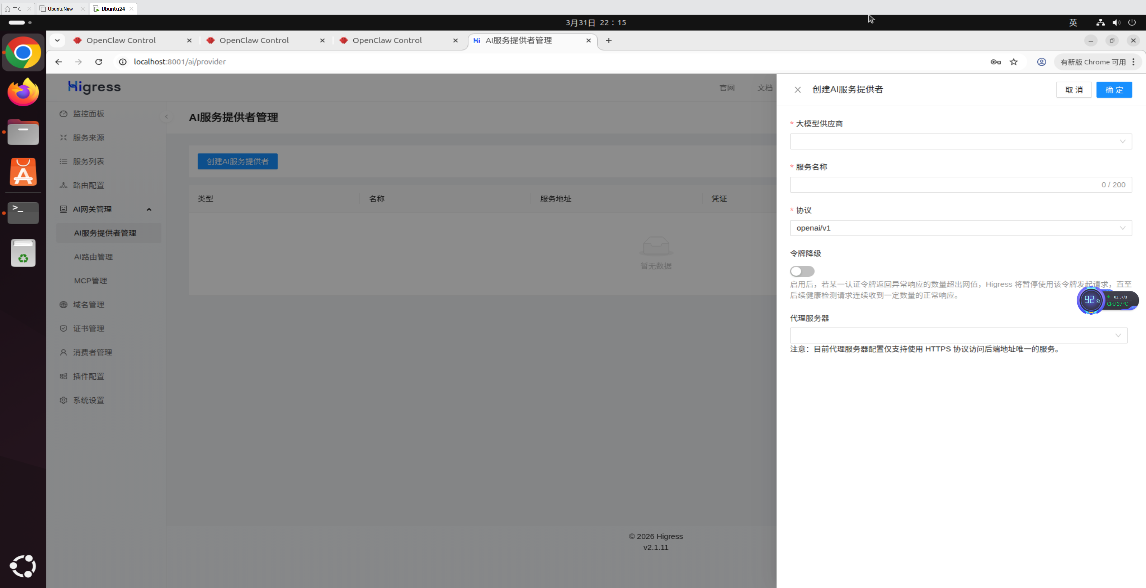 Higress 支持对接大模型服务(如 OpenAI、千问),需配置 AI 服务提供者。