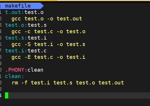 在上面的例子中,test.out 依赖的 test.o 不存在,make 会去寻找以 test.o 为目标文件的依赖关系;test.o 依赖的 test.s 也不存在,make 又会去找 以 test.s 为目标文件的依赖关系;然后 test.s 依赖 test.i,最后,test.i 的依赖文件 test.c 终于存在了,make 就会根据 test.i 的依赖方法形成 test.i,再逐步形成 test.s、test.o,直到最后形成 test.out。(类似于数据结构栈 -- 后进先出);