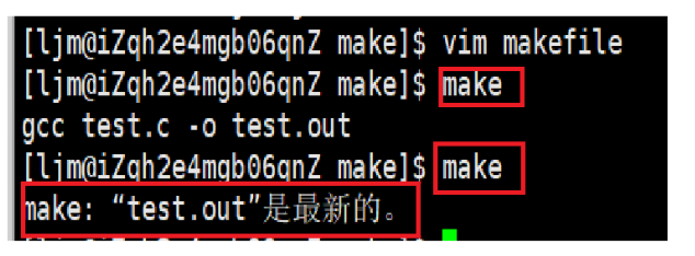 实际上,上面这种现象是 make 为了防止我们对已经编译好且未做修改的源文件重复编译而浪费时间;也就是说,如果 test.c 已经编译得到了 test.out,并且我们并没有对 test.c 做改动,那么我们再次 make 时 make 不会被执行;实际上 make 这样做是很有必要的,因为在工作中,编译一个工程往往需要几十分钟甚至几个小时,如果我们 make 每次都重新编译,势必会浪费很多时间。