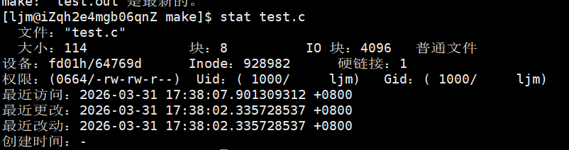make 判断源文件是否需要重新编译只与源文件的修改时间变动有关,与源文件的内容改动无关,我们可以通过 touch 命令来验证:(touch file :如果 file 已存在,则更新 file 的所有时间)