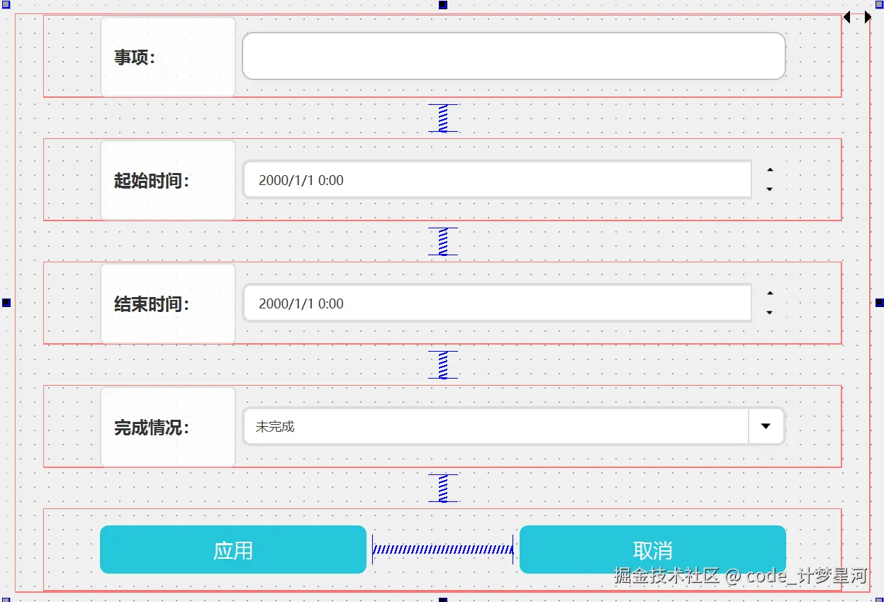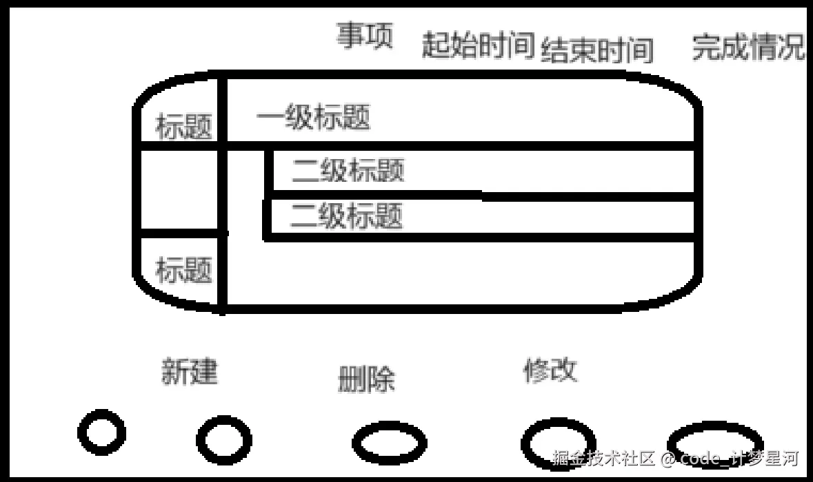 这是板块主界面应该有的样子,底部是导航栏按钮,再上一层是功能按钮,最上边是QTreeView控件,上表头写着事项、起始时间、结束时间、完成情况,左表头写着标题