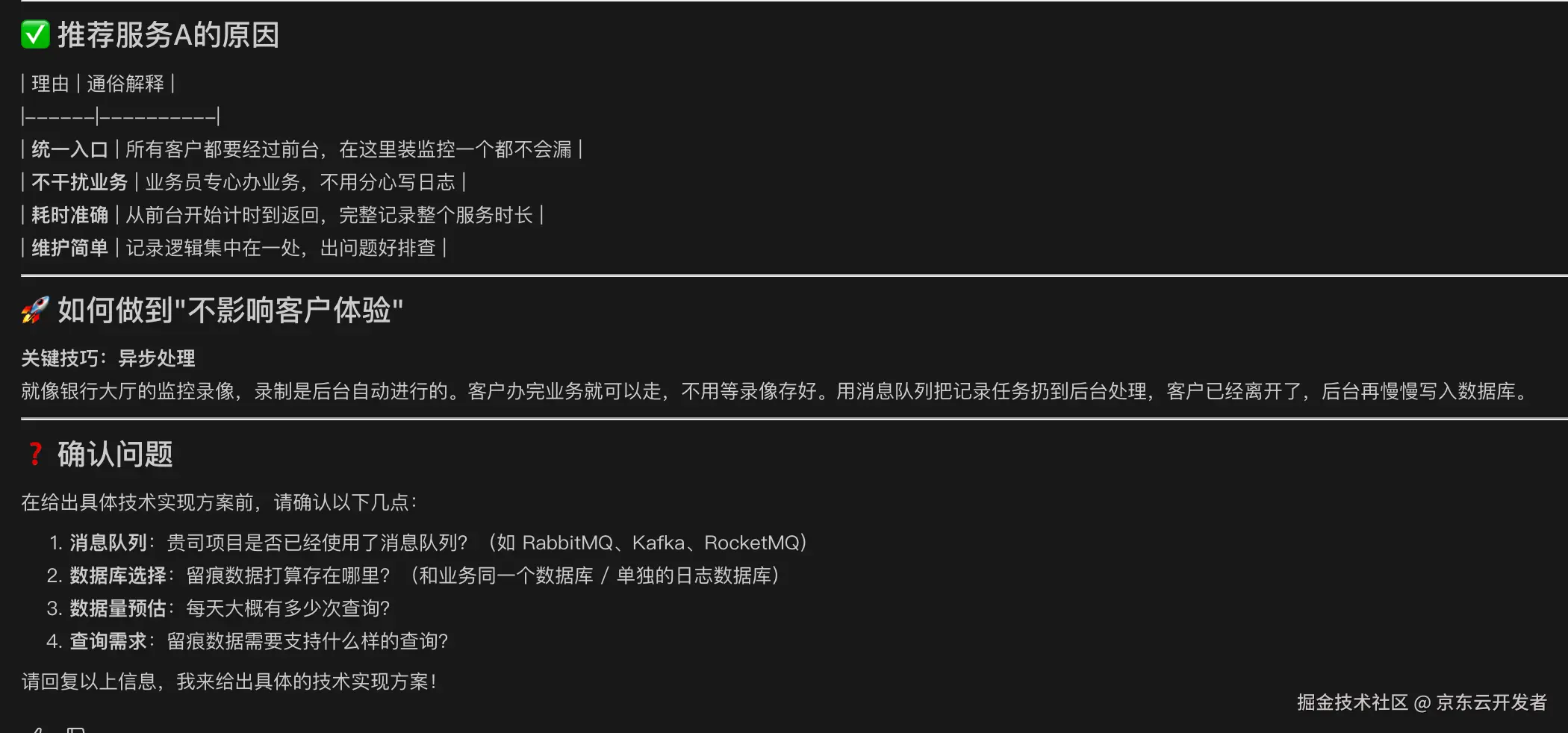"我知道AOP可以实现切面拦截,异步处理可以避免阻塞主流程,设计模式要遵循单一职责...具体怎么落地,提供我的想法,让AI来帮我完成。"