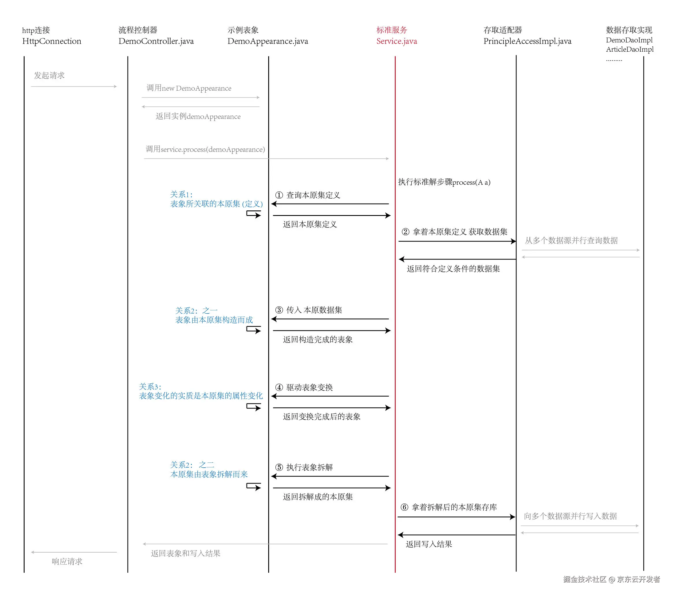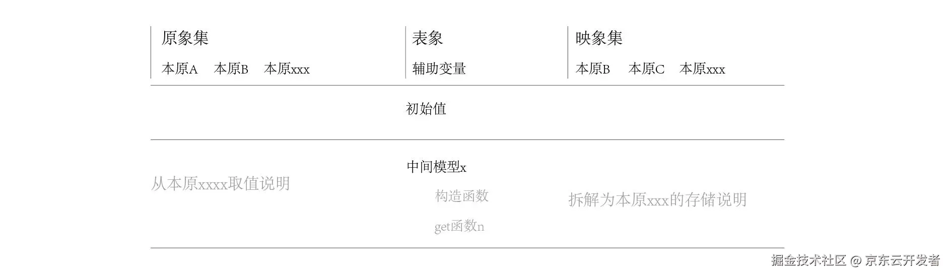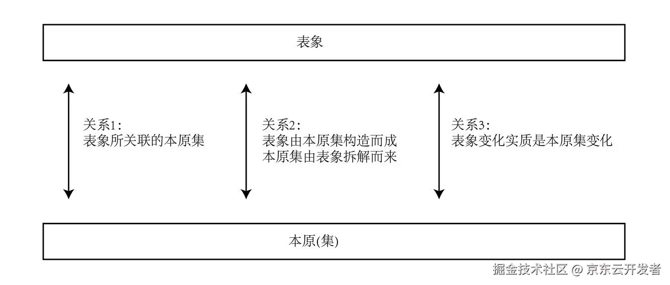 示例:载货车辆、转账现象;前后台交互的内容都可视为表象。 - 本原 :对表象进行理性分析后,所理解到的表象所构成的基础单元。
