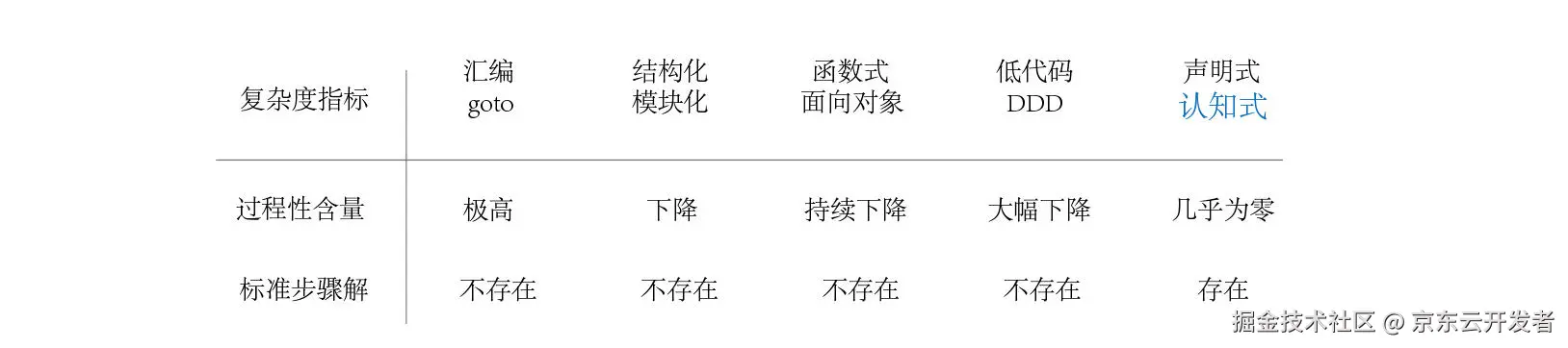 复杂度降解的历程,是不断的把过程剔除掉的历程。过程本身就是软件复杂度最大的来源。过程性含量是复杂度最重要的指标。过程性含量虽然未能量化,但可以定性对比。