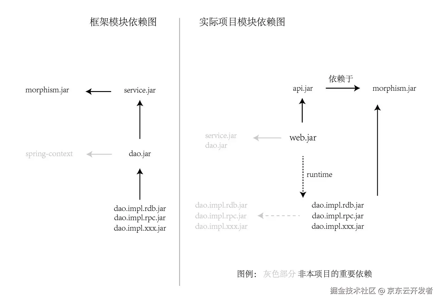 - dao.jar: 存取适配包。只存在于框架层。是service调用各具体dao.impl的适配桥梁。