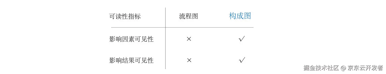 构成图的左侧,明确的列出此业务逻辑所依赖的全部因素。构成图的右侧,明确列出此业务逻辑所影响到的全部范围。而流程图中对因素和结果的描述,依赖于交互箭头上的文字描述,无法保证其规范性。
