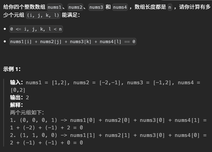 思路:for循环遍历1,2数组的所有和,负值加入到字典里;再for循环遍历3,4数组的和,如果in字典,加上字典的值即可。