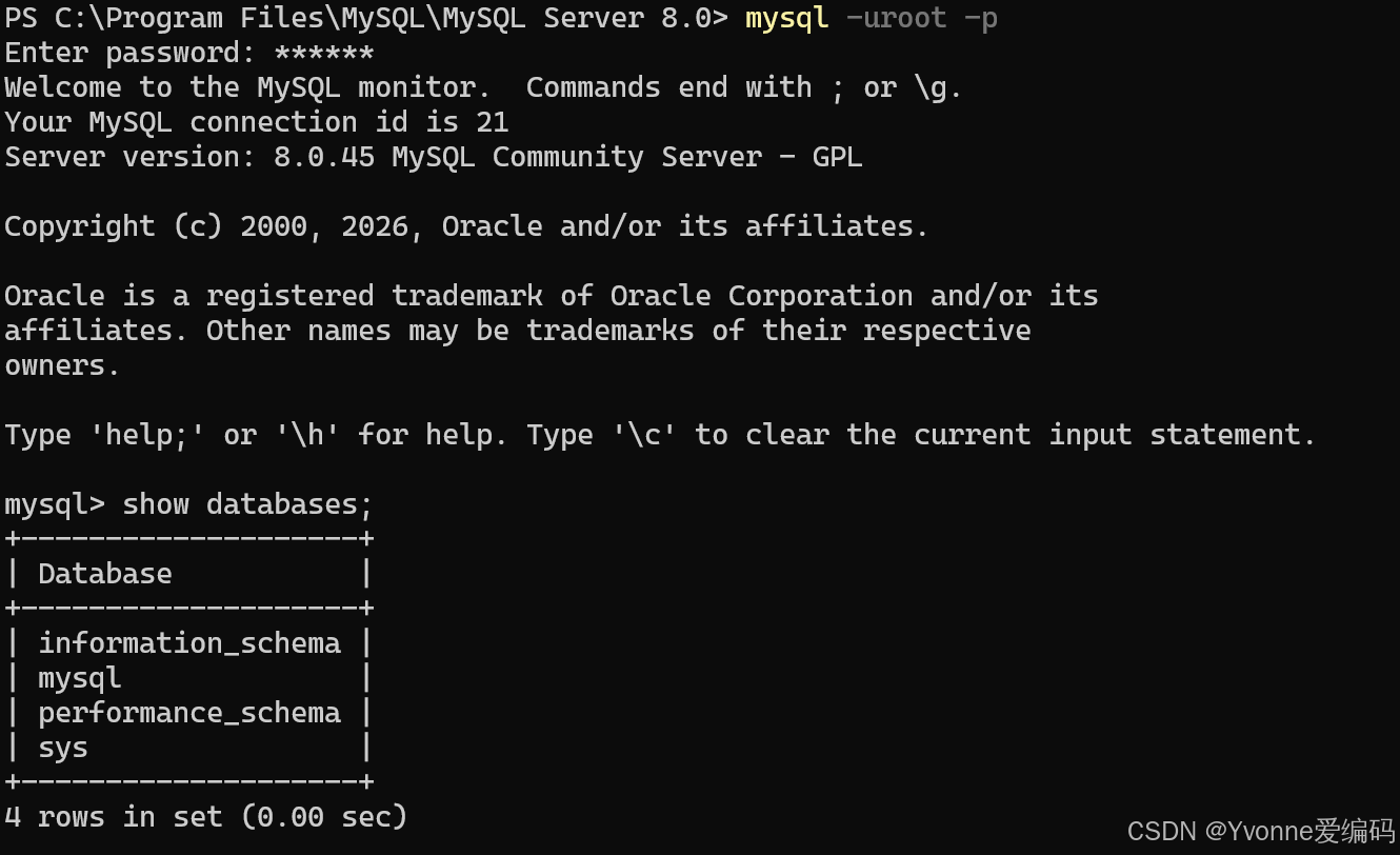 上述结果为 MySQL 全新安装后的默认库列表,后续自定义创建的库会新增到该列表中。