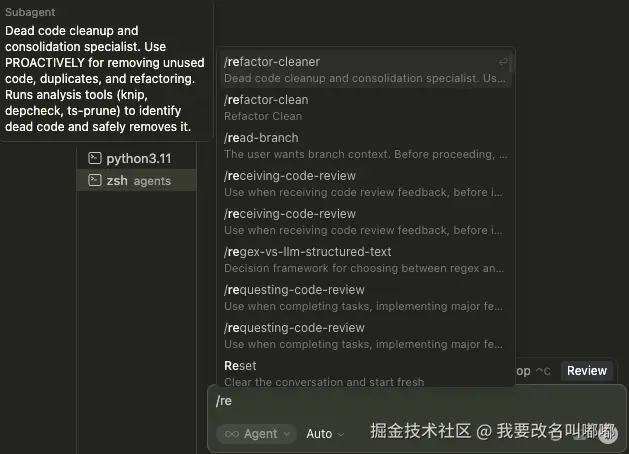 我在对话窗口输出"refa",还真让我看到了名叫"refactor-cleaner"的一个subagent,它的介绍简单些说是:清理僵尸代码、去掉重复逻辑。