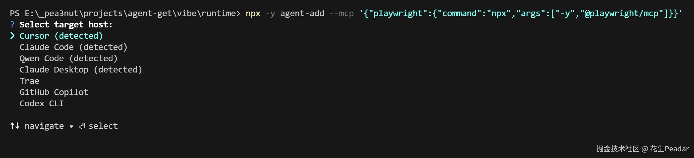 如果你不指定 --host,工具还会有一个交互界面,询问你要给什么 AI 工具安装: