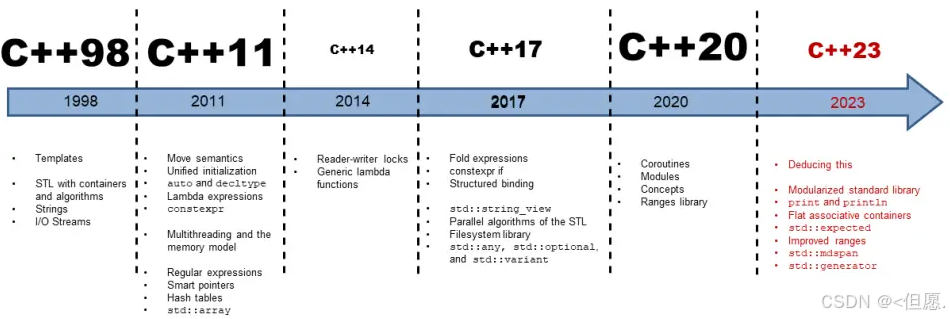 上面这张图的C++版本字体大小就是表示该版本的重要性(版本大小),在C++98开始C++委员会就有五年计划(每五年就制定一个版本), 所以在c++06一个出一个版本但是此时C++已经开始烂尾了(制定不出一个有用的版本),多少到了C++11有没有令人失望(制定了一个大版本)C++06-c++11之间的一个烂尾版本人们叫"C++0x",后C++委员会改成了三年计划(可能被网友骂了,后面就实施****三年计划有什么发布什么)。