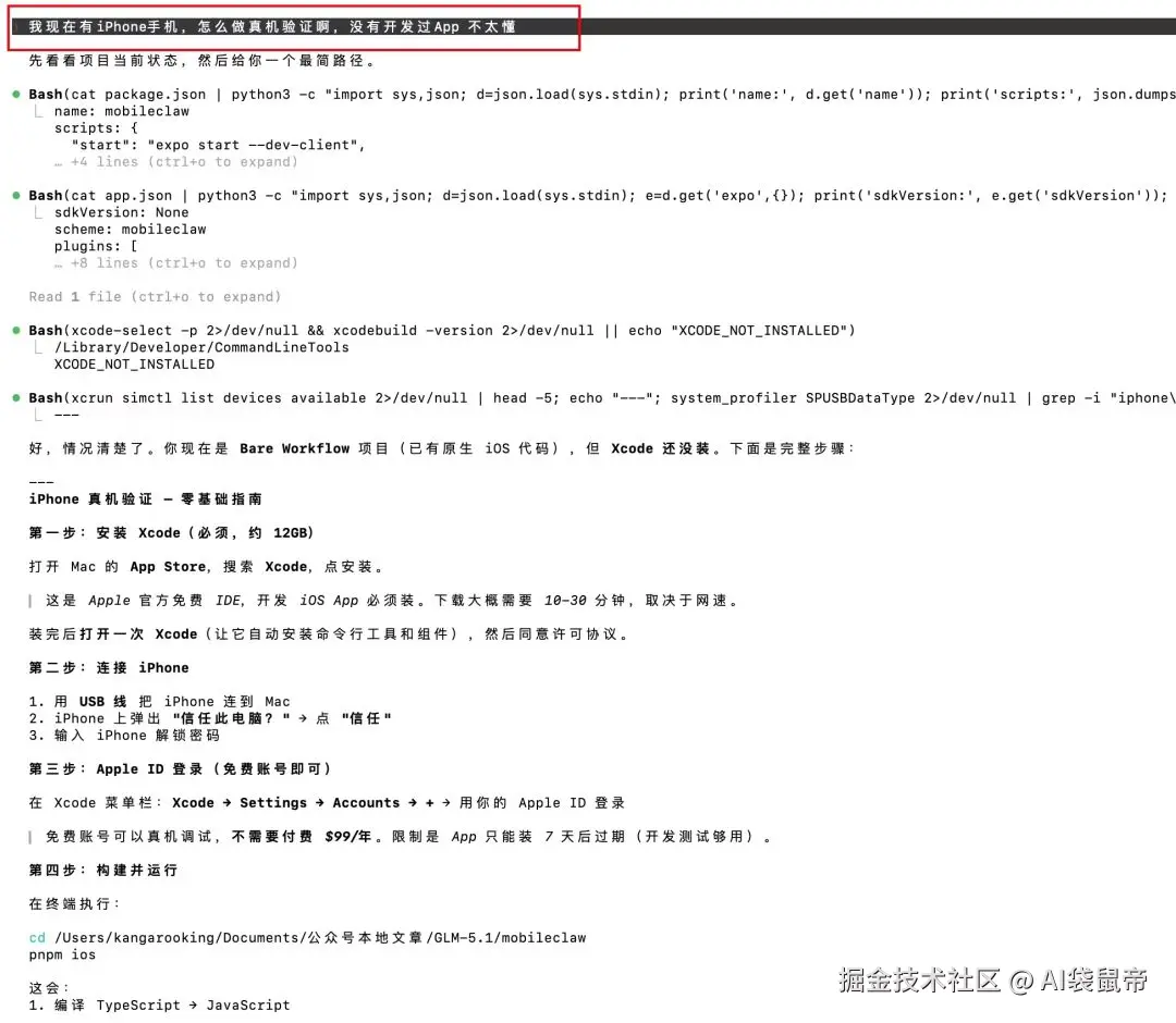 比如 怎么把写好的代码顺利编译进 iPhone 真机里去调试? glm-5v-turbo给我的建议是使用xcode,但是我的Mac有点旧版本不支持最新的xcode,它又帮我去找适配的旧版本xcode安装。