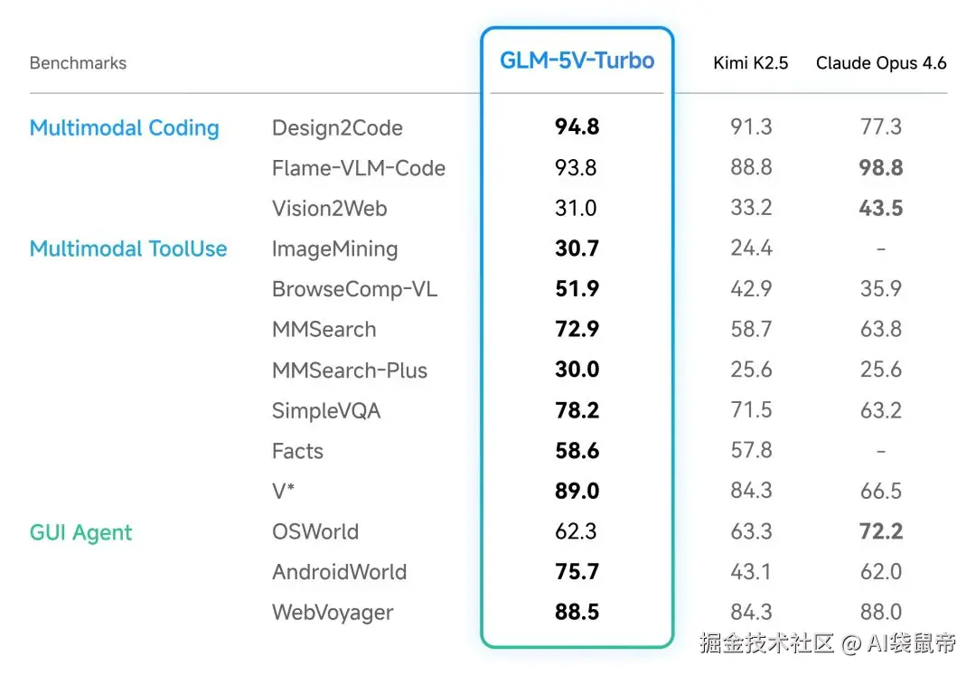 目前要兼顾顶级的代码能力、Agent 执行能力,同时还必须支持强大的多模态视觉识别,国内原本能打的是前不久刚出的豆包2.0和 Kimi-K2.5 但我发现,智谱最近更新了一个模型,而且是专门针对龙虾和多模态编程环境深度训练过的专用基座模型:GLM-5V-Turbo