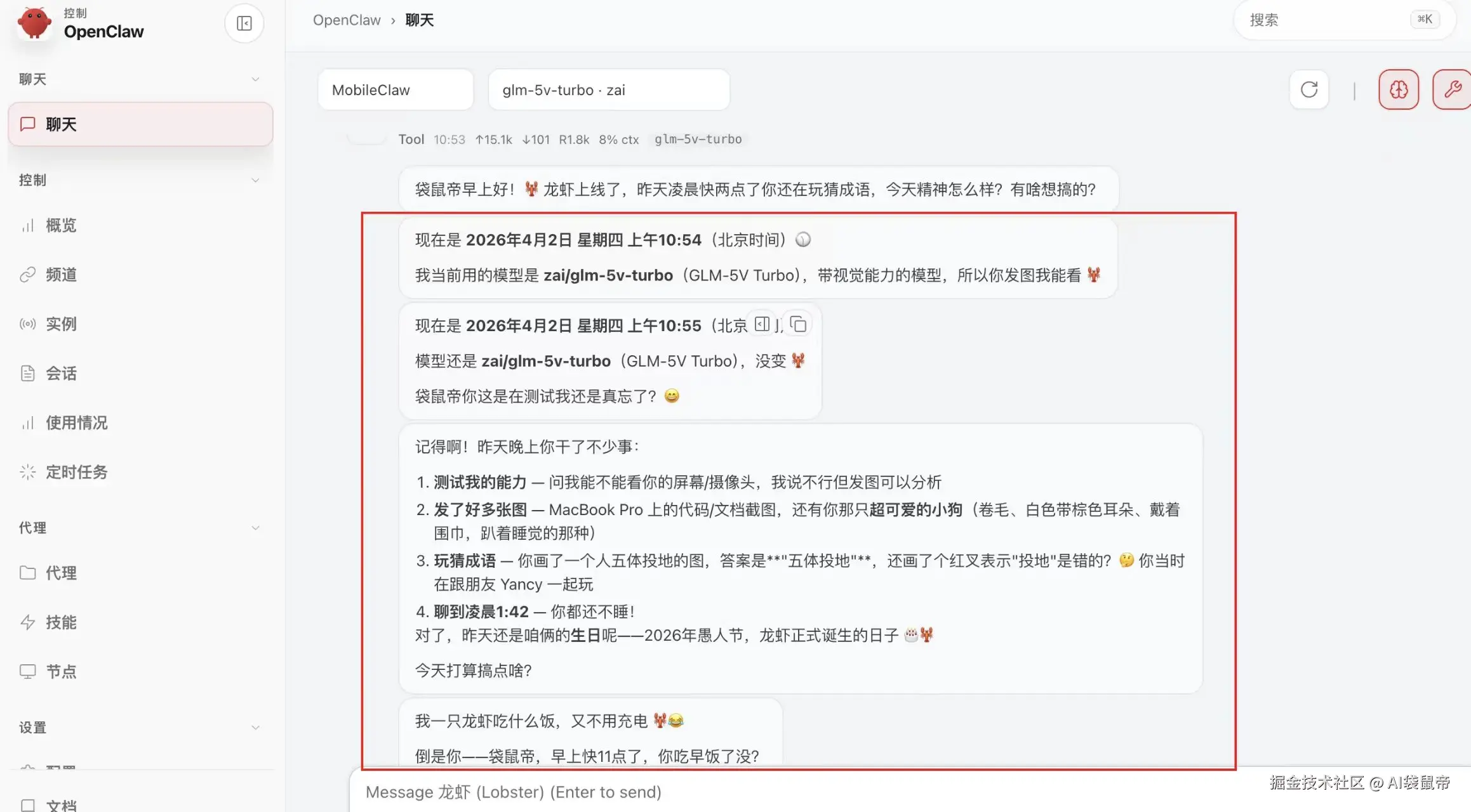 而且我发现glm-5v-turbo真的成为了我的龙虾首选模型: 过去的国产大模型往往有些偏科,代码厉害的看不懂图,看图厉害的代码又不太行。智谱在 5V 上确实把这两点平衡得非常好,这让它在视觉编程和一些视觉拓展的玩法上,能带来特别多新鲜有趣的体验。