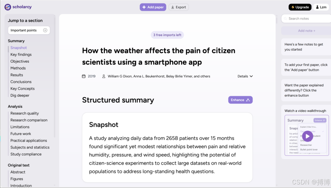4. 批量精读 :Elicit 批量导入文献,生成结构化摘要,提炼核心观点;