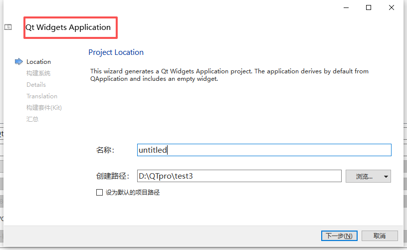 此向导会生成一个Qt Widgets应用程序项目。该应用程序默认继承自QApplication,并包含一个空小部件。