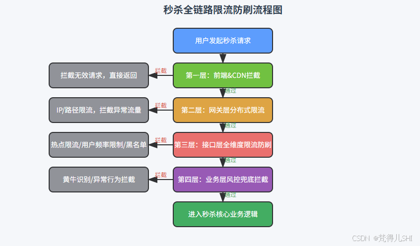 - 安全第一:秒杀是黄牛攻击的重灾区,全链路都要做防刷、风控、签名校验,杜绝恶意攻击