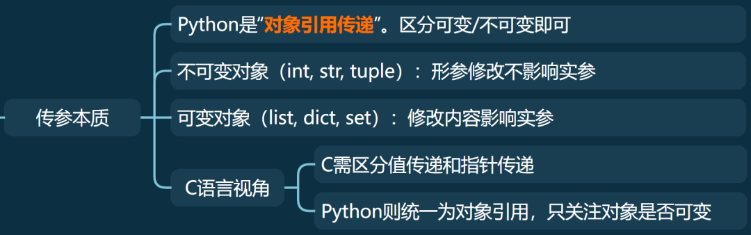 • 可变对象(list, dict, set):修改内容影响实参。