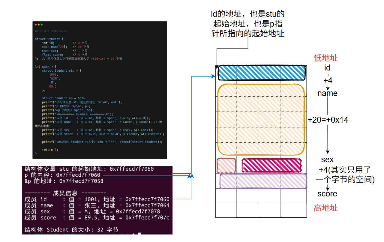 };struct Student *p = &stu; printf("结构体变量 stu 的起始地址: %p\n", &stu); printf("p 的内容: %p\n", p); printf("&p 的地址: %p\n", &p); printf("\n======== 成员信息 ========\n"); printf("成员 id : 值 = %d, 地址 = %p\n", p->id, &(p->id)); printf("成员 name : 值 = %s, 地址 = %p\n", p->name, p->name); // 数组名即地址 printf("成员 sex : 值 = %c, 地址 = %p\n", p->sex, &(p->sex)); printf("成员 score : 值 = %.1f, 地址 = %p\n", p->score, &(p->score)); printf("\n结构体 Student 的大小: %zu 字节\n", sizeof(struct Student)); return 0;}