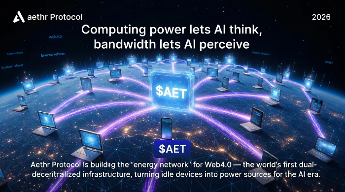 2026年3月,总部位于美国特拉华州的 Web4.0 基础设施项目 Aethr Protocol 正式面向全球发布其技术架构与经济模型。项目提出"**算力让 AI 思考,带宽让 AI 感知"**的核心理念,通过构建去中心化的双资源网络,将全球数十亿台闲置设备(PC、手机、宽带)转化为 AI 智能体可调用的"数字能源",并让贡献者获得 $AET 奖励。
