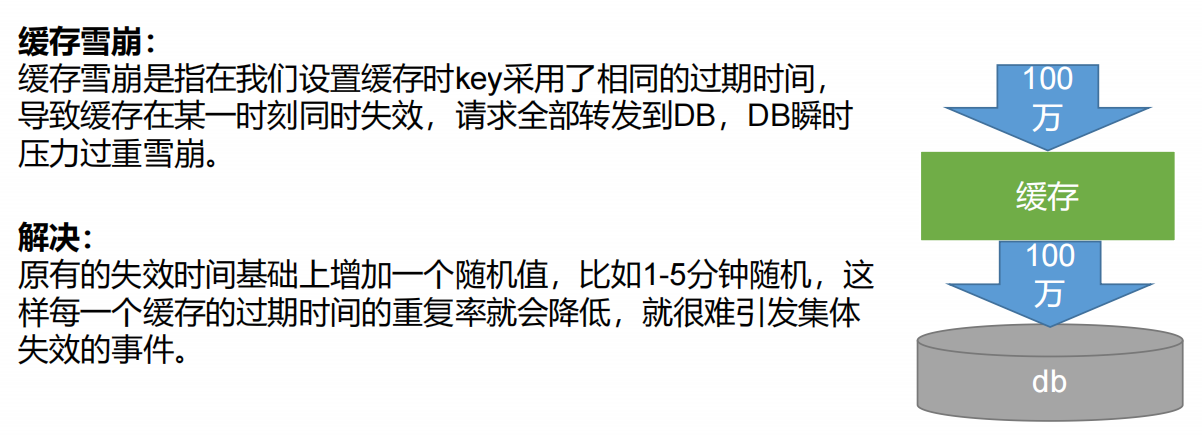 - 缓存雪崩:大量的key同时过期。解决方法:加上随机时间;加上过期时间。"spring.cache.redis.time-to-live=3600000"