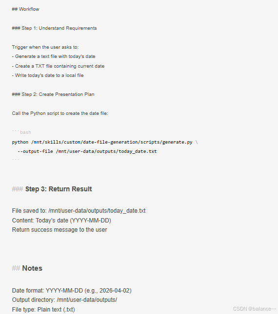 This skill generates a local TXT file and writes today's date (YYYY-MM-DD format) into it.