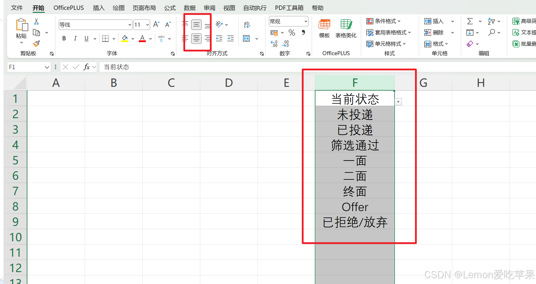 本博主要开始找工作啦,嚯嚯嚯,开心,所以想要制作一个找工作追踪表格,这样可以知道自己的工作进展,有一列要设置该工作的当前状态,有要求的,如下图所示:
