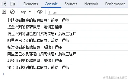 我们实例化两个发布者掘金和阿里巴巴,再实例化两个订阅者郭靖和杨过,然后让郭靖只订阅前端的招聘信息,杨过只订阅后端的招聘信息,然后掘金只发布前端的岗位信息,阿里巴巴只发布后端的岗位信息。上面的测试将打印:
