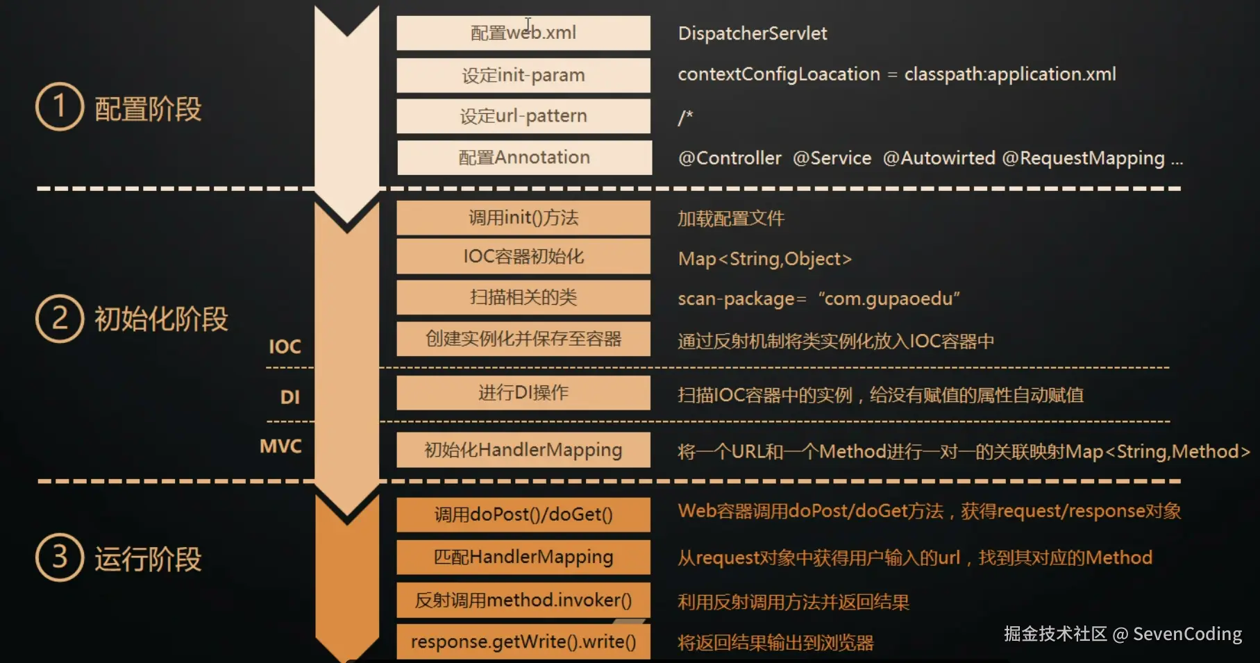 IoC容器的初始化过程:IoC容器本质上是一个Map集合,用来存储所有被管理的对象实例。在SevenDispatcherServlet中,我们定义了一个简单的IoC容器: