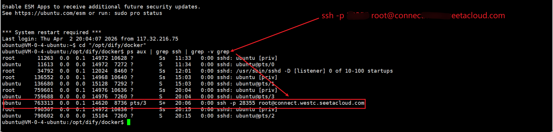 腾讯云服务器上执行:ps aux | grep ssh | grep -v grep